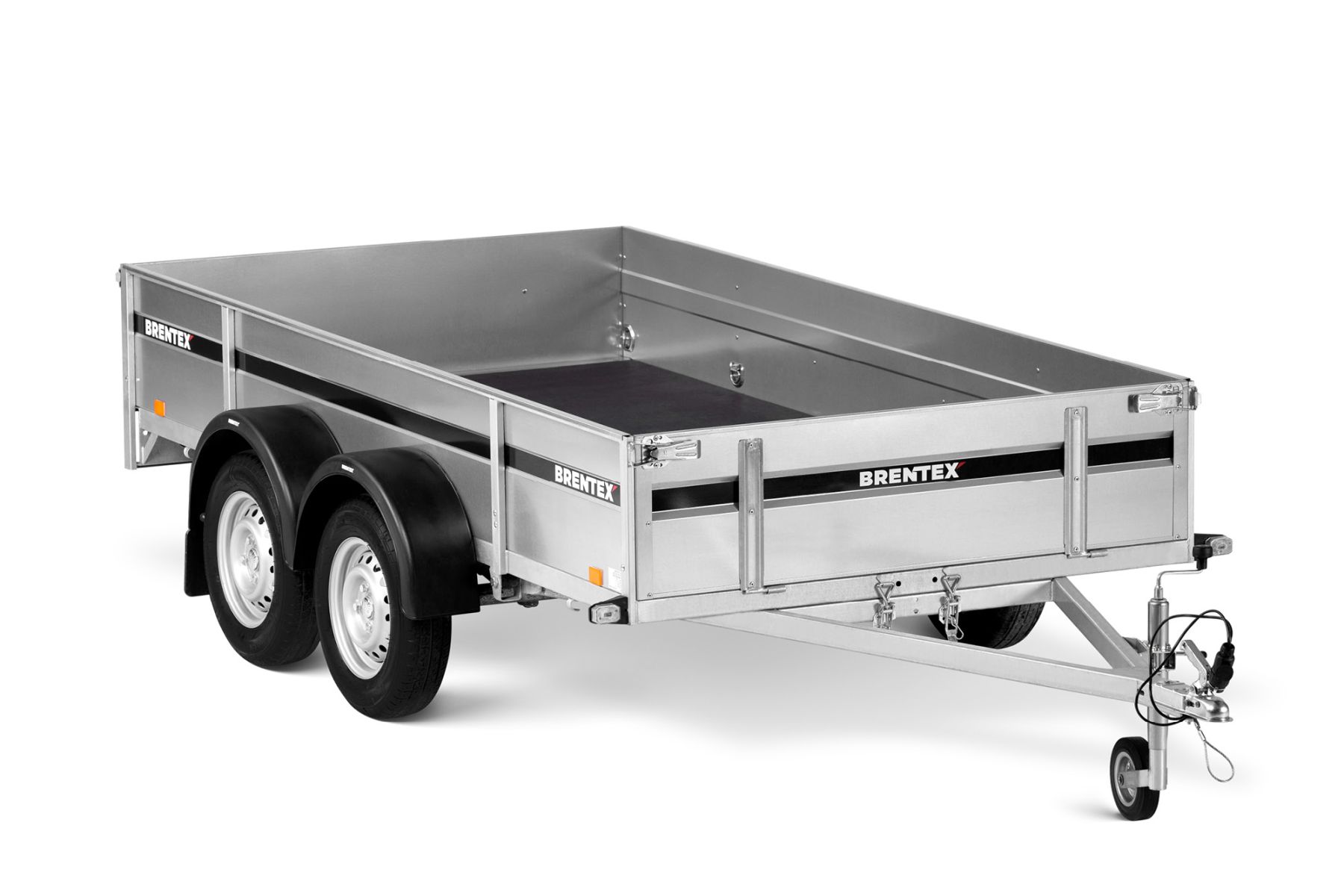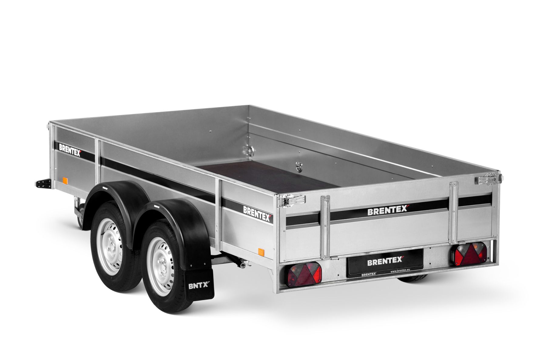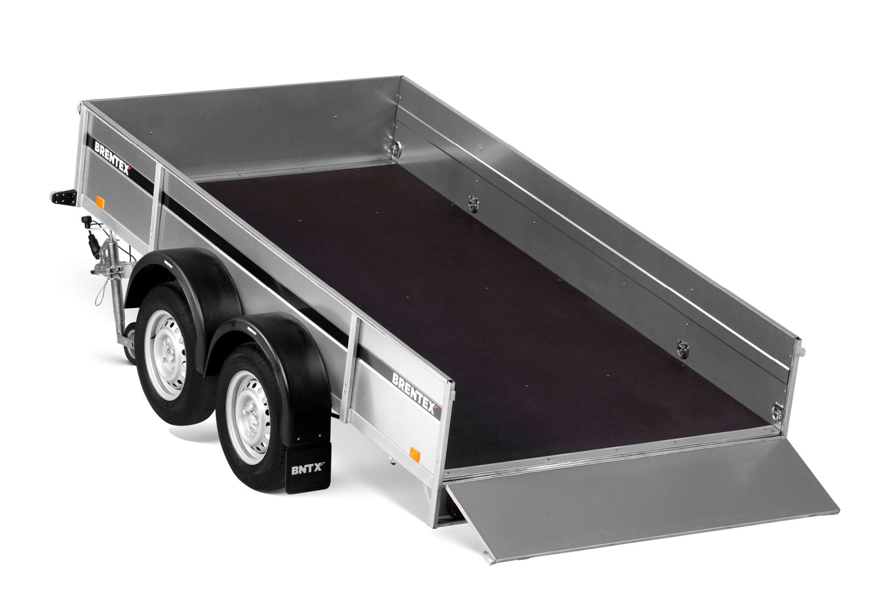 Двухосный прицеп на горячеоцинкованной цельносварной раме. Подходит как для индивидуального, так и для профессионального использования. Подвеска моста на рессорах: горячеоцинкованная балка моста, ступицы KNOTT (Германия), 3-листовые рессоры, амортизаторы. Дно ящика покрыто ламинированной водостойкой фанерой 12 мм. Передний и задний борт усилены двойным профилем, их можно откинуть назад или полностью снять. 8 петель для крепления груза внутри ящика и 4 крючка приварены снаружи к нижнему краю рамы. Электросистема Aspöck (Австрия), с адаптером на 7/13 контактов.