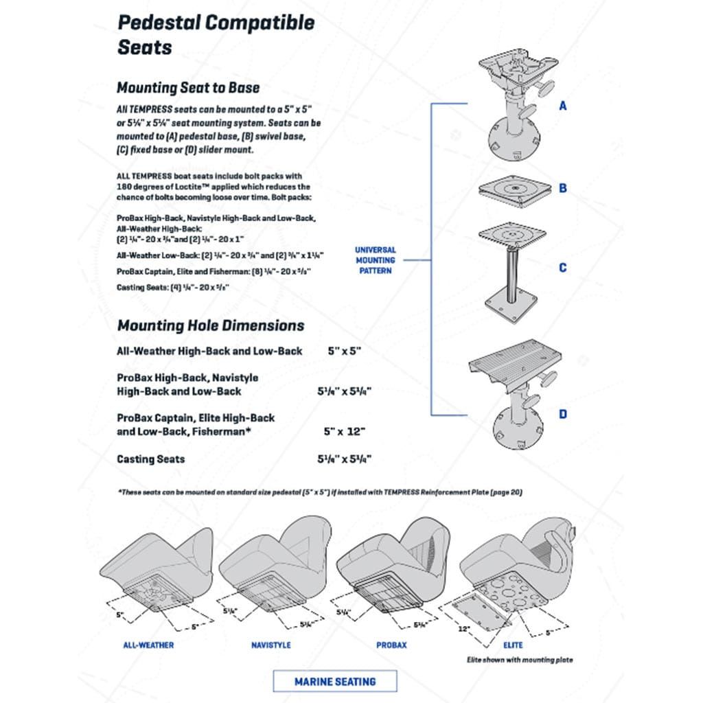 TEMPRESS on teinud koostööd USA juhtivate lülisambakirurgide ja ergonoomikaekspertidega, et luua läbimurdeliselt patenteeritud ProBax® Boat Seat. ProBax on ainus paadiiste, mis on kliiniliselt tõestatud, et see pakub optimaalset pikaajalist selja- ja ülakeha tuge. See iste on varustatud patenteeritud aluse ja seljatoe kahetuumalise vahu tugisüsteemiga, mis on saadaval ainult TEMPRESSi kaudu. See süsteem on ka veekindel ja vastupidav pikaajaliseks kasutamiseks. ProBax on õmmeldud UV- ja kulumiskindla polüesterniidiga ning kaetud 30-untsiga. mereklassi vinüül, mis talub kõiki elemente. Universaalne istmepoltide muster on valatud raami sisse, et kinnitada mis tahes 5-1/4-tolline kinnitussüsteem või pjedestaal. Kaasas on Loctite'i plaastriga roostevabast terasest kinnitusdetailid. Võtke kontroll oma paadisõidu ja kalapüügi üle, kontrollige oma keha ja minge üle TEMPRESSi ProBaxile. Valmistatud USA-s.